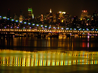 New York City skyline with George Washington Bridge in foreground, taken from New Jersey scenic outlook station.