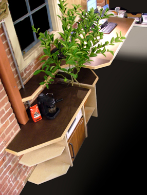 The “Lime Tree Bar” is custom-built and directly integrated into the workplace with the same general desk aesthetics. The bar’s primary feature is a Palestine sweet lime tree, intended to supply all limes used in bar drinks. Features a cutting board and a flip-up grating where the fruit’s remains are brushed into the tree’s pot to fertilize for future limes. The lime tree was chosen because citrus trees are capable of fertilizing themselves from their own fruit, strengthening the idea of self-sustainability.