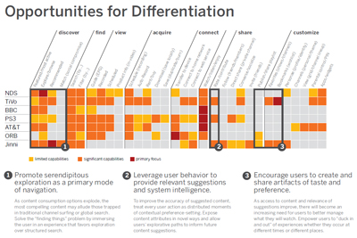 To identify opportunities for differentiation, as well as understand required areas of parity relative to a set of competitors, it is often useful to compare directly across abstracted product features, or user capabilities: what does their product allow users to do?
