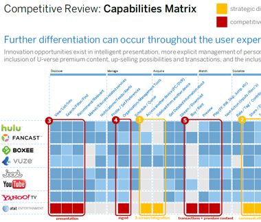 Such an analysis exposes patterns across competitive/comparative solutions, and can highlight where various players have particular strengths or gaps in their offerings.