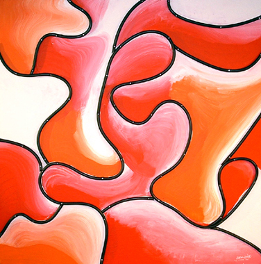 A response to a design assignment, this "string" painting was literally started by tracing out a string that had been dropped onto the canvas. I tried to create depth in the work with variations in saturation of chroma, in addition to balancing the vibrant colors of red and orange.